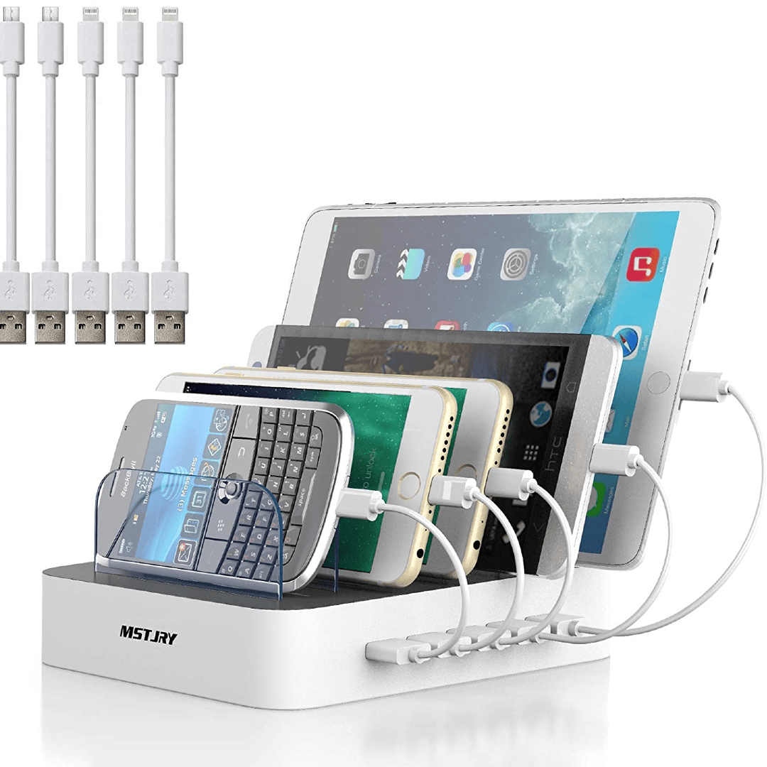 Power up multiple devices at once using this sleek charging station. The space-saving station has five ports and removable dividers that hold everything from phones to large tablets. Plus, it comes with short USB cables that are compatible with various electronics, so you can reduce cord clutter.