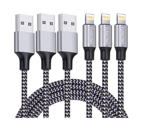 With three 6-foot cords in the pack, these nylon braided cables make it easy to keep all your devices charged and ready to go. The aluminum alloy head resists damage from bending, and the nylon braiding ensures durability. These cords are available in a gray color, and they are compatible with Apple devices like iPhones and iPads.