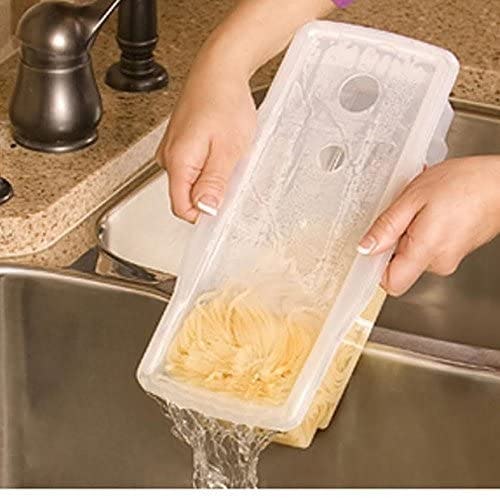 This microwave pasta maker lets you cook pasta without messy boil overs, sticking, and a ton of dishes to clean. Just put dried pasta into the container, add water, and microwave — there's a handy guide to times. When it's al dente (or however else you like it), drain it with the lid and serve. But it’s usefulness doesn’t stop there, this gadget can also be used to cook veggies and rice in your microwave as well.