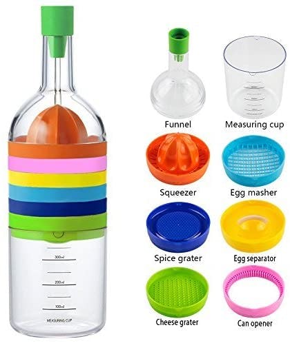 This handy kitchen tool combines eight different kitchen tools into one unit: a funnel, a juicer, a grater, an egg cracker, a shredder, a can opener, an egg separator, and a measuring cup. All the parts of this set stack together into a wine bottle shape, and they are color coded so the one you need is a breeze to find.