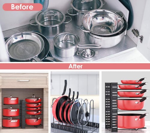 This adjustable pan organizer can be customized to accommodate your pots, pans, and lids and with eight shelves, there’s plenty of room for your kitchen helpers. An M-shaped groove keeps everything in place, and you can use it in a cabinet or on a counter. The 24 rubber sleeves keep your items in place and noise to a minimum.