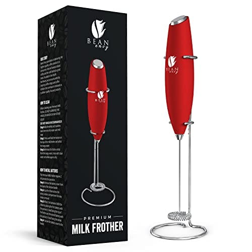 For barista-style coffee, use this handheld milk frother to whip up your favorite drinks. The battery-powered frother has an on/off switch on the top, a soft silicone handle, and a stainless steel whisk at the bottom. It only takes about 15 seconds to create a frothy foam, and it comes with a stainless steel stand for when not in use.