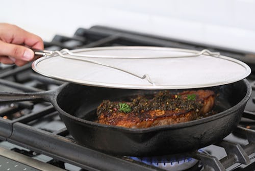 Protect your hands and stove from hot grease with this splatter screen designed to block up to 99% of pops and splashes. The large, 11.5-inch guard fits over most pans and skillets, is made out of durable and rust-resistant stainless steel, and has feet on the bottom so you can rest on the counter without making a mess.