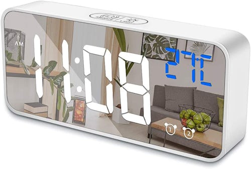 This digital alarm clock pulls out all the stops, and is armed with a voice control function, temperature display (you can choose from Celsius or Fahrenheit), three adjustable brightness settings, 13 alarm ringtones, and a mirrored front face for a low-key, futuristic look.