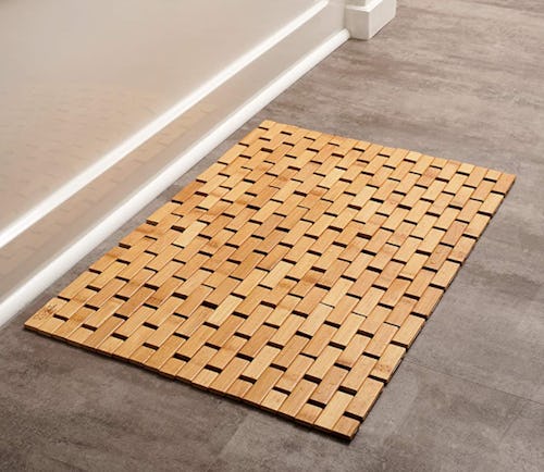 This eco-friendly bamboo bath mat is a clean and modern way to keep wet feet off the floor. It's durable, flexible, and designed with a rubber grips on the underside that keep it in place. Use it on tile or place it over the carpet to keep it dry, then roll it up when you're not using it.