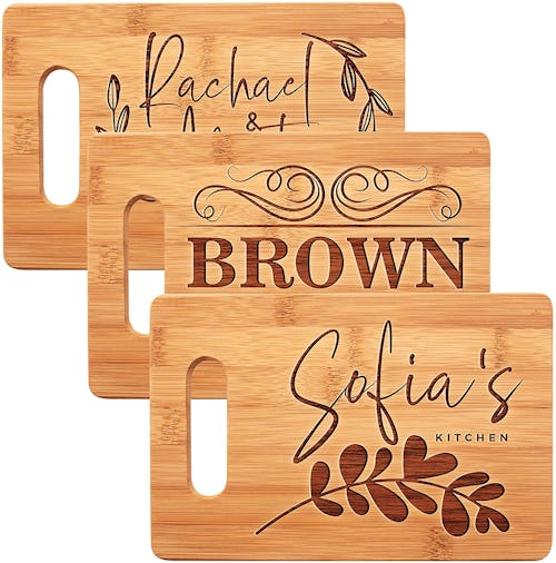 This customizable cutting board makes for a great wedding, housewarming, or holiday gift. Available in three sizes and 11 design options, it's made from eco-sustainable bamboo, and you can personalize it with a laser engraving.