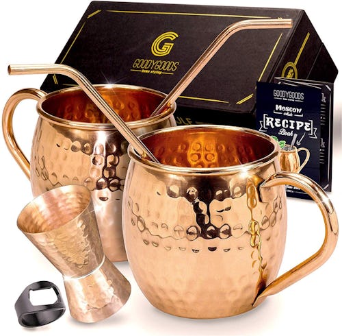 Made from 100% copper, this set of Moscow mule mugs comes with all the essentials needed to make the timeless cocktail: two mugs, two reusable straws, a jigger, a cleaning cloth, a thumb bottle opener (for the ginger beer), and a recipe book.
