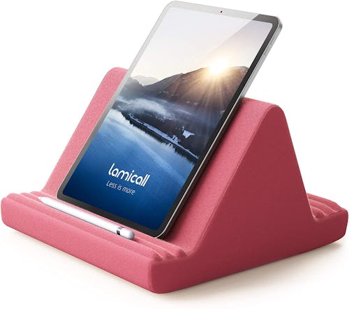 This tablet stand is sturdy but padded, so you can use it comfortably on your lap. It has three angle options for finding the best view, and since it's dual-sided, you can use it for two tablets at once.