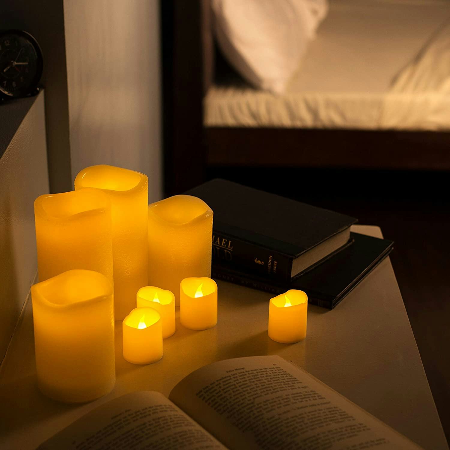 Create relaxing candlelit vibes with these LED flameless candles. The set includes tall, medium, and votive candles with pre-installed batteries, and each one emits warm amber light with flickering faux flames. Plus, there's a remote control to set timers, turn the flickering on and off, and adjust brightness levels.