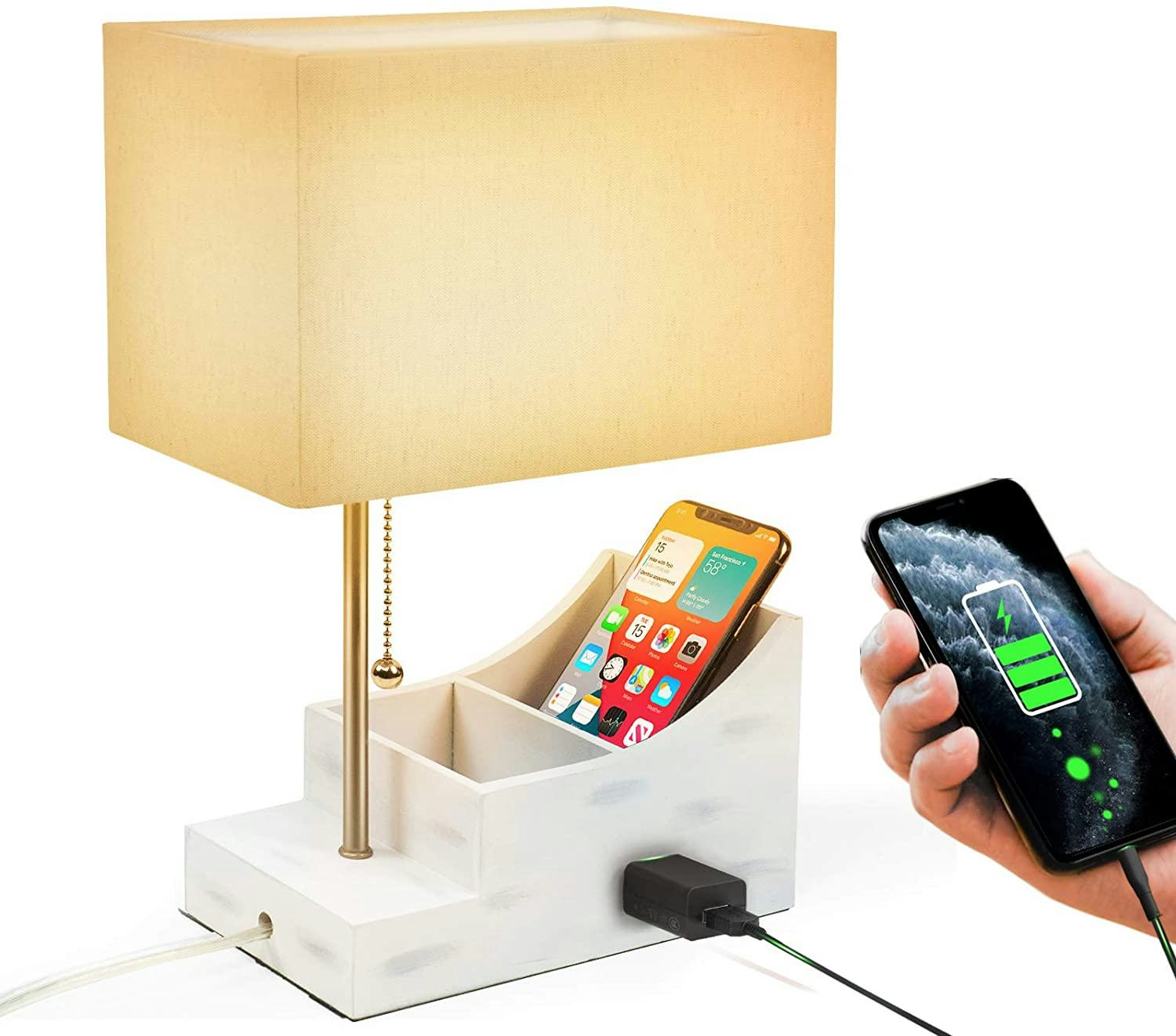 Keep your nightstand or desk organized with this multifunctional bedside desk lamp. The stylish lamp includes a wooden base with two storage compartments, and there's a built-in AC outlet, so you can charge your phone and other devices. The lamp is topped off with a sleek fabric shade and pull-chain switch.