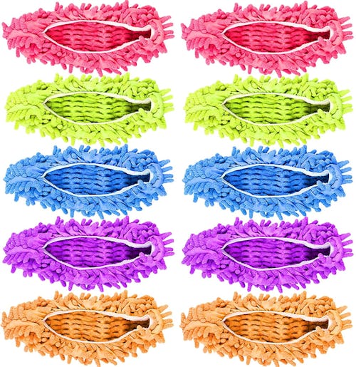 Make cleaning easier (and a little more fun) with these microfiber mop slippers. Each order includes five pairs of colorful slippers that lift dust, dirt, and pet hair while you walk. You can also attach them to a mop head or use them as cleaning towels.