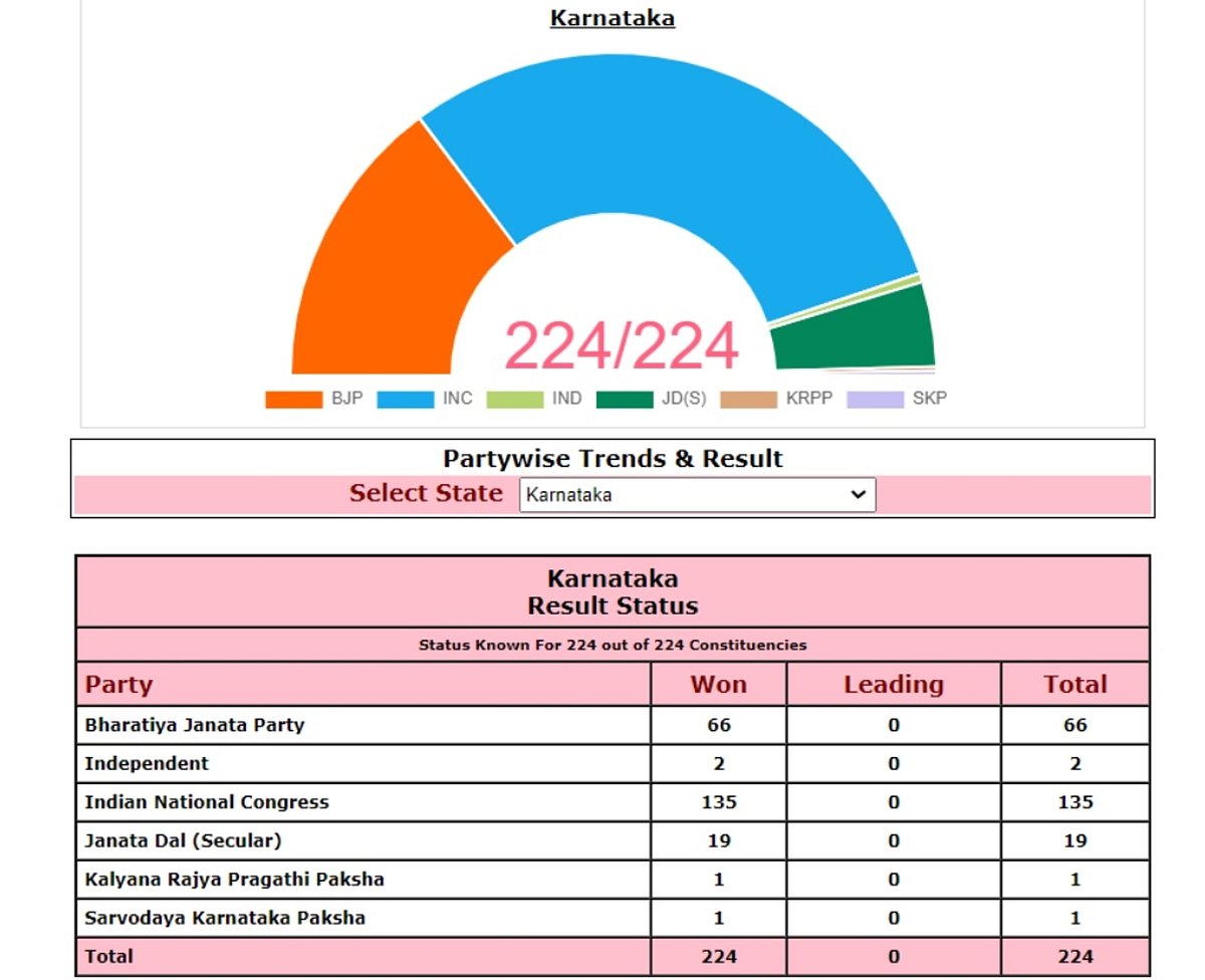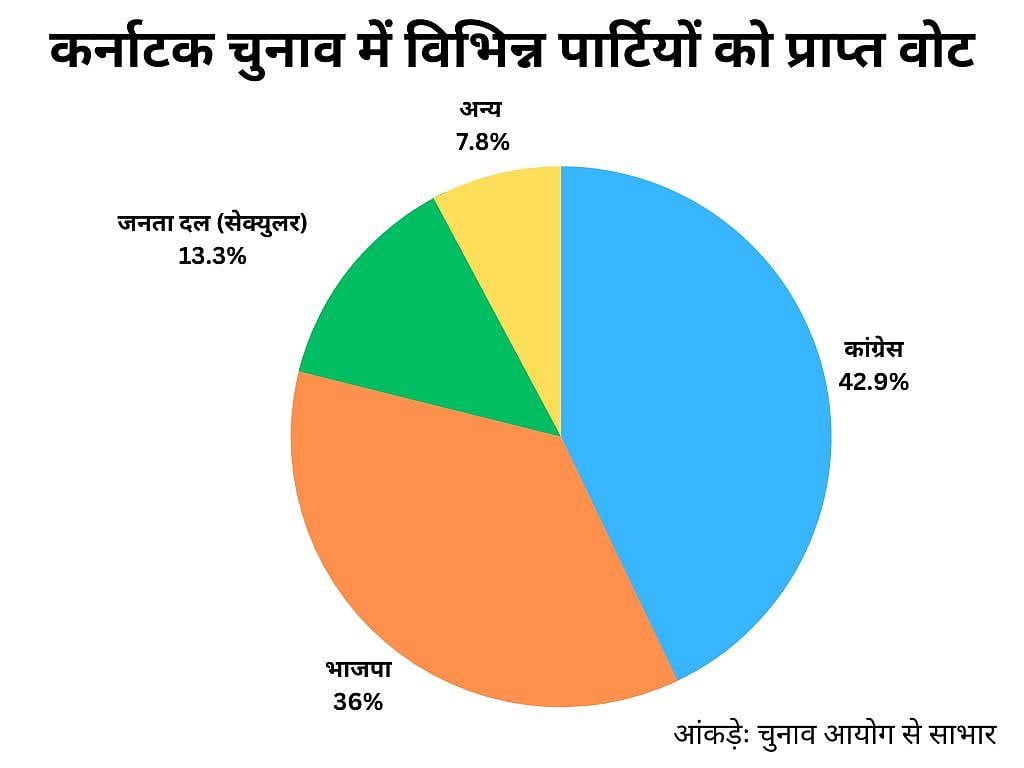 कर्नाटक के चुनावी परिणाम आ चुके हैं. कांग्रेस को स्पष्ट बहुमत मिल चुका है तो वहीं भारतीय जनता पार्टी को इस बार जनता ने विपक्ष में बैठा दिया है. वहीं, किंगमेकर का सपना पाले बैठी जनता दल सेक्युलर (जेडीएस) के न सिर्फ सपने टूटे हैं बल्कि राजनीतिक जमीन में भी सिमट गई है. 2024 में होने वाले आम चुनावों का सेमीफाइनल माने जा रहे इन विधानसभा चुनावों में कांग्रेस को 135 सीट, भाजपा को 66 सीट और जेडीएस को मात्र 19 सीटों पर ही जीत मिली है. वहीं दो सीटों पर निर्दलीय विधायकों को जीत मिली है तो अन्य दो में से एक कल्याण राज्य प्रगति पक्ष तो दूसरी सर्वोदय कर्नाटक पक्ष ने जीती है. वोट शेयर की बात करें तो कांग्रेस को 42.9 फीसदी, भाजपा को 36 फीसदी और जेडीएस को 13.29 फीसदी वोट प्राप्त हुए हैं.
