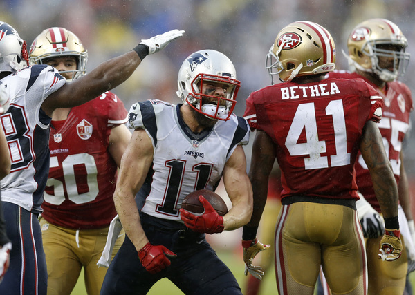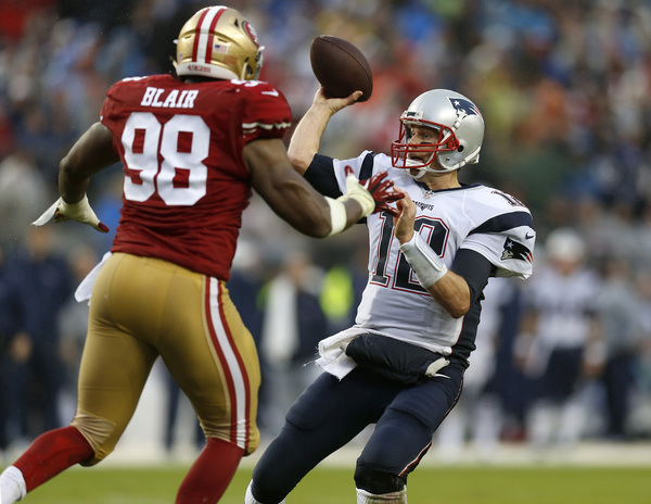 Brady, meanwhile, showcased his Hall of Fame-worthy skills throughout the game, most evident on his final two touchdown throws. His third touchdown pass came on a magical escape: he avoided DeForest Buckner's attempt at a shoe-string sack, and then with Ronald Blair charging, Brady fell backward toward the ground as he flung a 5-yard scoring strike to Danny Amendola for a 20-10 lead.