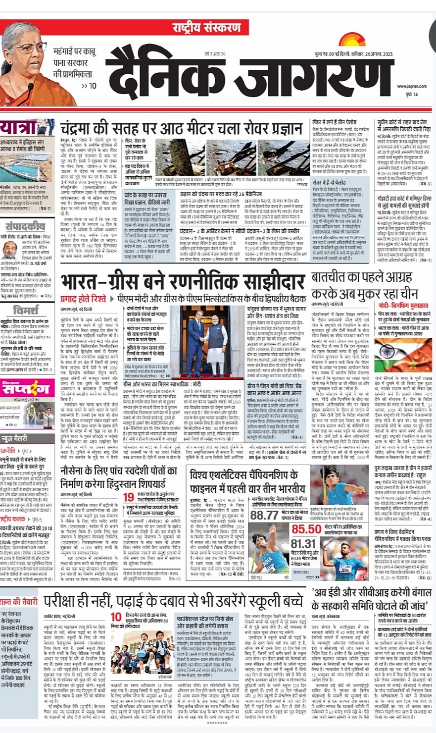 हिंदी के प्रमुख अख़बारों ने आज एक नहीं अलग-अलग ख़बरों को प्रमुखता दी है. किसी अख़बार ने रोवर प्रज्ञान की चांद पर चहलकदमी तो किसी ने प्रधानमंत्री नरेंद्र मोदी की ग्रीस यात्रा को प्राथमिकता दी है.