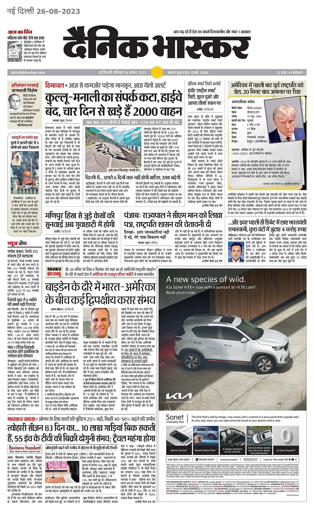इसके अलावा सुप्रीम कोर्ट का फैसला- मणिपुर हिंसा से जुड़े केसों की सुनवाई अब गुवाहाटी में होगी, अमेरिका में पहली बार राष्ट्रपति को जेल- 20 मिनट बाद जमानत पर रिहा हुए डोनाल्ड ट्रंप, इंडिया स्मार्ट सिटी अवार्ड- इंदौर को मिला पहला रैंक आदि ख़बरों को भी अख़बार ने पहले पन्ने पर जगह दी है.