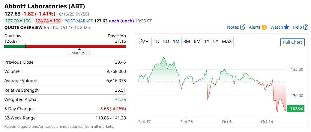 ABT stock currently trades at $127.63, and the company pays a forward annual dividend of $2.36, which translates to a yield of approximately 1.8%. The company’s dividend payout ratio is 46.06%, meaning there’s room to grow it while maintaining sufficient funds for R&D.