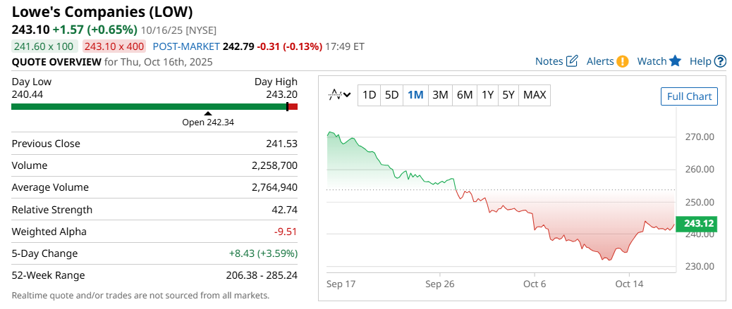Lowe’s stock is currently trading at $243.10, and the company pays a forward annual dividend of $4.80, which translates to a forward yield of just under 2%. The company’s dividend payout ratio is 38.46%, which means the company pays less than half of its profits as dividends- so there’s a lot of room to grow it down the line.
