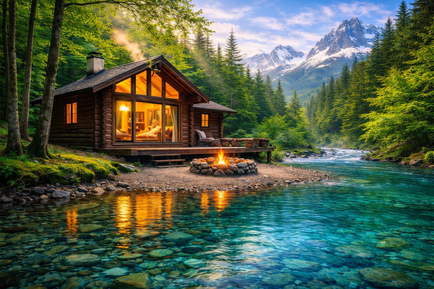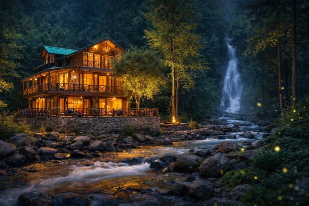 You wake up here to a river that sounds like static for your thoughts. No honking. No playlist. Just water crashing over rocks like it has better things to do than entertain you. Wooden cottages sit right next to the river. Not aesthetic cottages. Real ones. Slightly damp. Slightly cold. Perfect.