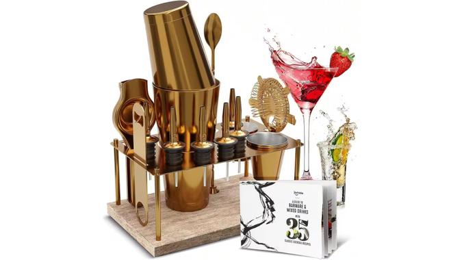 The Eatex stainless steel bartender kit is perfect for retirees who like to be prepared to mix any cocktail for their guests. The 17-piece bar tool set has a stand that holds two stainless steel 3-ounce shot glasses, a mixing spoon, a citrus juicer, a flat bottle opener and six liquor pourers. Other items in the set are a Hawthorne strainer, a double-sided jigger, a two-piece Boston cocktail shaker and a recipe booklet. Built to last, the set is dishwasher-safe and resistant to rust, scratches, fingerprints and leaks.