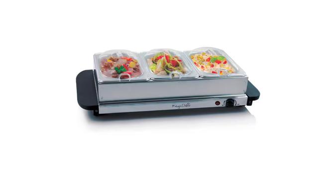 The MegaChef stainless steel warming tray has several functions that make hosting holiday meals easy for retirees. It comes with three removable section trays with lids and a removable tray frame. Use the warming tray to keep appetizers, sauces and beverages at the right temperature, or use the three section trays to serve prepared food while maintaining the temperature for an extended period. Two side handles ensure easy transfer from countertop to tabletop.