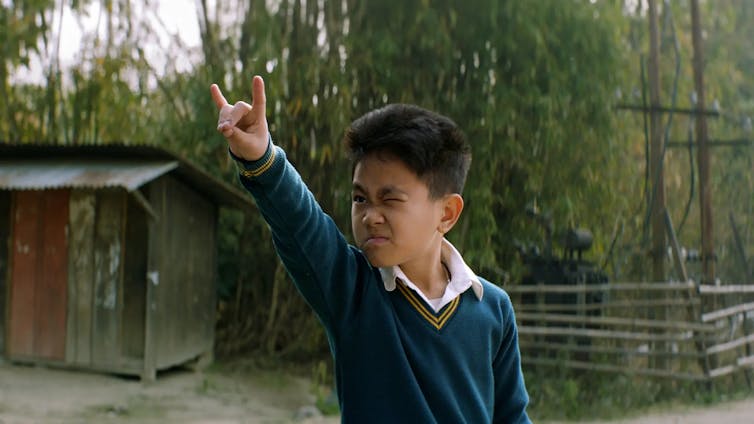 As they make their way, we’re treated to views from Manipur, India’s North East state near Myanmar, which we rarely see in mainstream Indian cinema. Boong itself tips its hat to Bollywood a few times, such as when Raju shows his excitement upon hearing the song Lungi Dance from the Bollywood blockbuster Chennai Express (2013), or when the the chief villager’s secret home cinema is adorned with Hindi film posters.