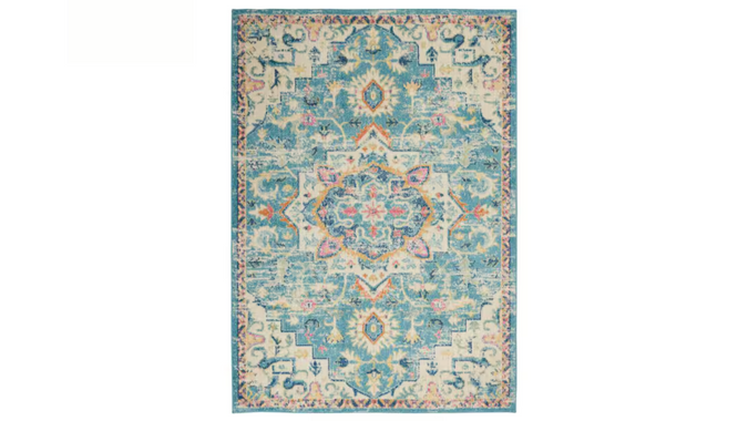 Elevate your room with the 9-foot by 12-foot Nourison Persian Area Rug that comes in a Passion Ivory and Light Blue color. Ideal for high traffic areas in the home, the rug is fade-resistant and during the sale, consumers can save 10%.