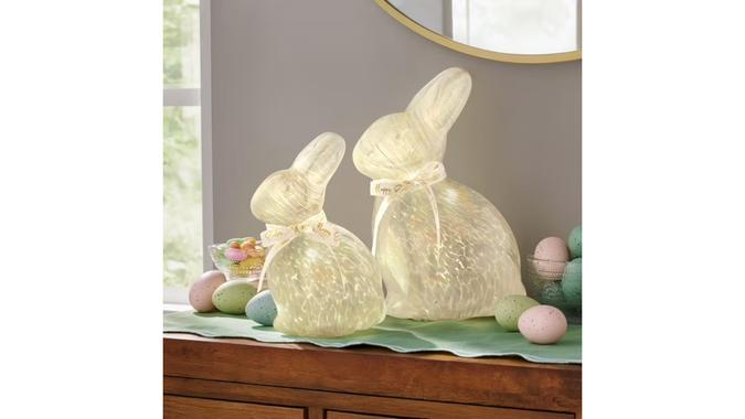 Nothing says spring quite like Easter. These pre-lit glass bunnies make the perfect decor. Display them on the mantel or use them as a centerpiece. They’re made of luminescent art glass with a pearl finish, and they feature a “Happy Easter” bow perfect for the season.