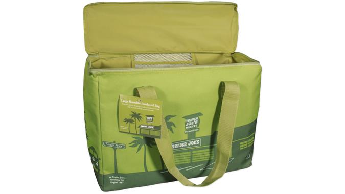 Trader Joe’s olive green large reusable insulated bag has the ability to hold around 8 gallons of groceries. This insulated bag is also equipped with a zippered lid, padded inside, reinforced straps and internal pocket to hold belongings. Use it to transport food or drinks to holiday parties or get-togethers with family or friends.