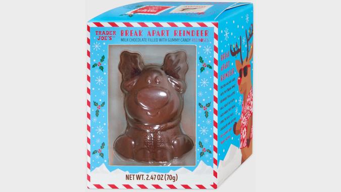 If you’re looking for a sweet stocking stuffer, the Break Apart Reindeer fits the bill. The milk chocolate reindeer is filled with red, nose-shaped gummy candies.