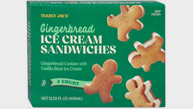 This seasonal frozen treat combines two beloved desserts — gingerbread cookies and vanilla ice cream. Each package contains four ice cream sandwiches.
