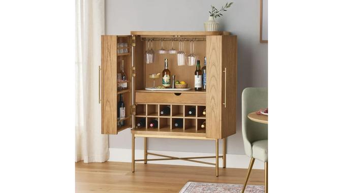 A midcentury modern designed Moberly bar cabinet with wine rack storage is the ideal cabinet for storing all stemware and drink essentials. It makes great use of space with side door storage for extra bottles. Solid wood construction with gold door handles and hardware lends to its sophistication, which works well in dining rooms, living rooms and lounge areas.