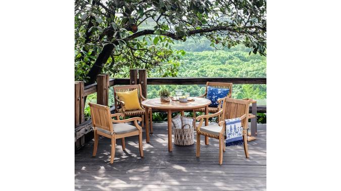 This Mosko teak outdoor dining set will provide a high-end look to any patio or deck. It’s made from weather-resistant Indonesian teak, which means it won’t rot or decay and requires only minimal maintenance. The four chairs include cushions with removable beige covers.