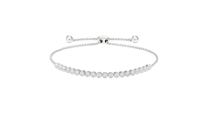 The classic style of the diamond tennis-style bolo bracelet is the perfect accompaniment to a formal evening dress or just designer jeans and a T-shirt. It features a row of 84 round diamonds set in sterling silver, with the ability to wear well for extended periods of time.