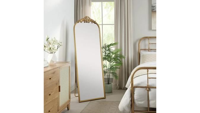 This Azalea Park gold full-length mirror has an air of simple elegance with its gold filigree design, which blends well with any decor. Its easel back allows for free movement and ease of placement in any room of the house.