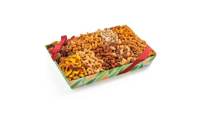 If you’re visiting family or friends this holiday season and aren’t sure what to bring, consider getting a healthy snack gift basket. This particular basket comes with a variety of nuts, snack mixes and trail mixes, including pistachios, sesame sticks and honey mustard pretzel bites.