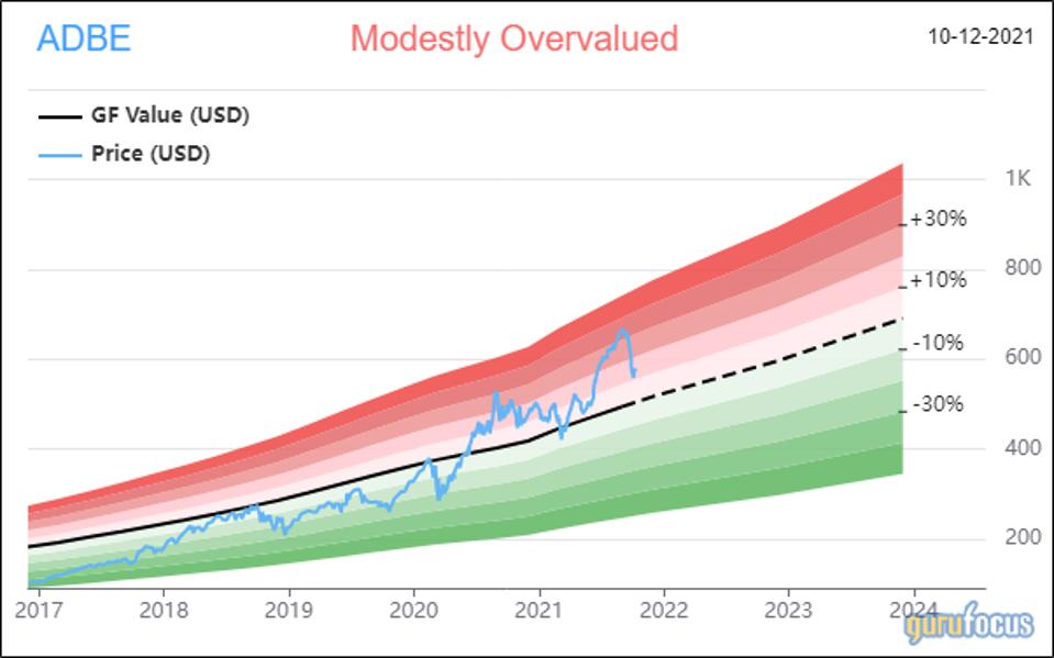 The company’s profitability scored a 9 out of 10 rating on the back of an expanding operating margin, strong returns on equity, assets and capital that outperform a majority of competitors and a high Piotroski F-Score of 8 out of 9, indicating conditions are healthy. Adobe also has a predictability rank of one out of five stars. According to GuruFocus, companies with this rank return an average of 1.1% annually over a 10-year period.