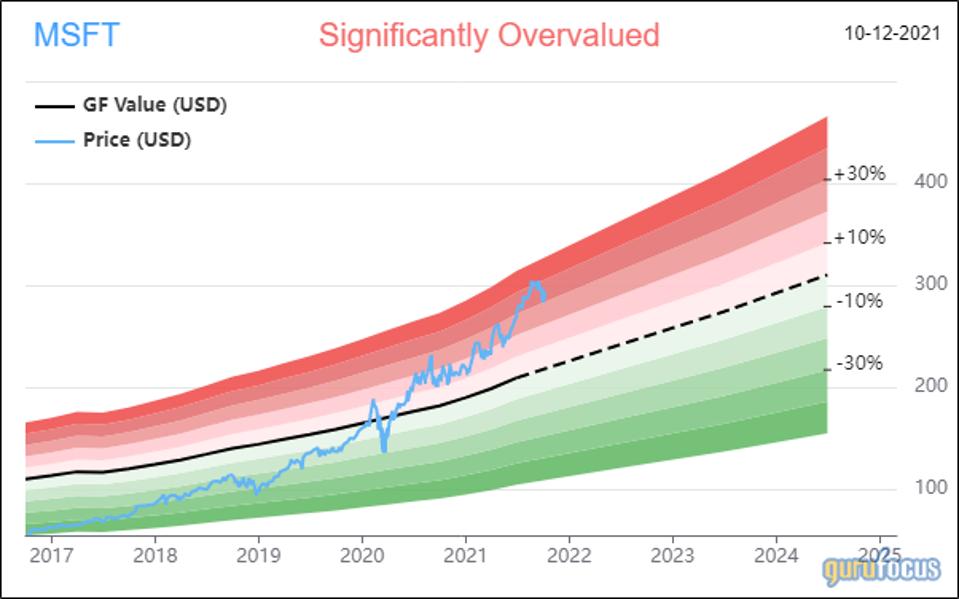 Headquartered in Redmond, Washington, the software company founded by Bill Gates (Trades, Portfolio) has a market cap of $2.21 trillion; its shares were trading around $293.97 on Tuesday with a price-earnings ratio of 36.61, a price-book ratio of 15.6 and a price-sales ratio of 13.33.