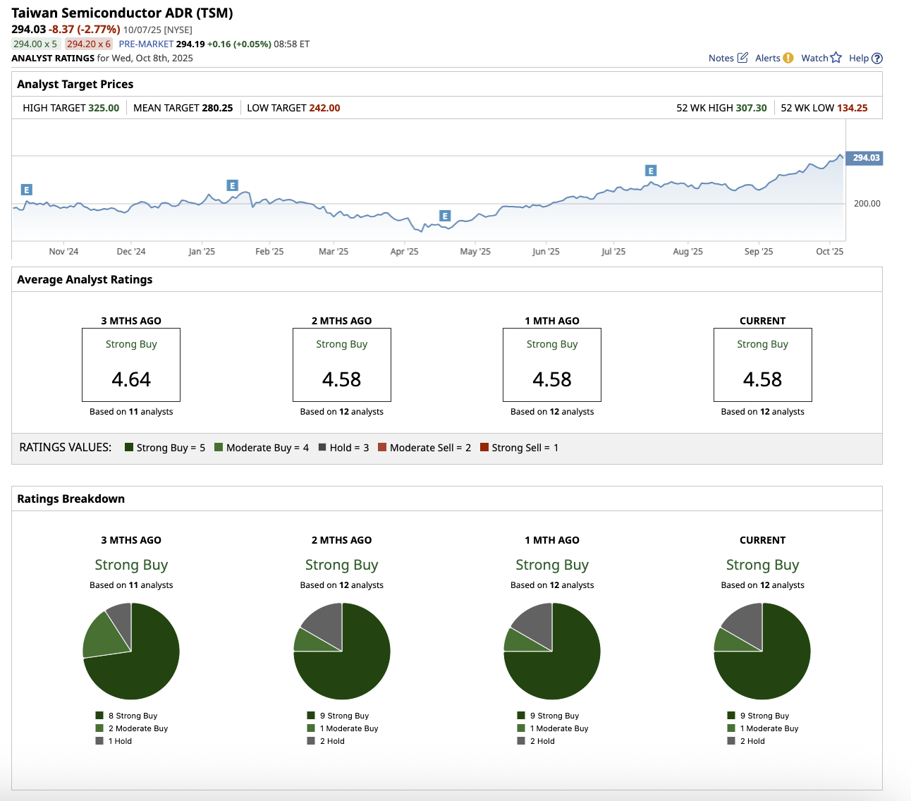 Overall, Wall Street rates TSM stock a “Strong Buy.” Out of the 12 analysts that cover the stock, nine rate it a “Strong Buy,” one says it is a “Moderate Buy,” and two rate it a “Hold.” TSM stock has exceeded its average target price of $280.25. However, its high price estimate of $325 implies upside potential of 10.5% from current levels.