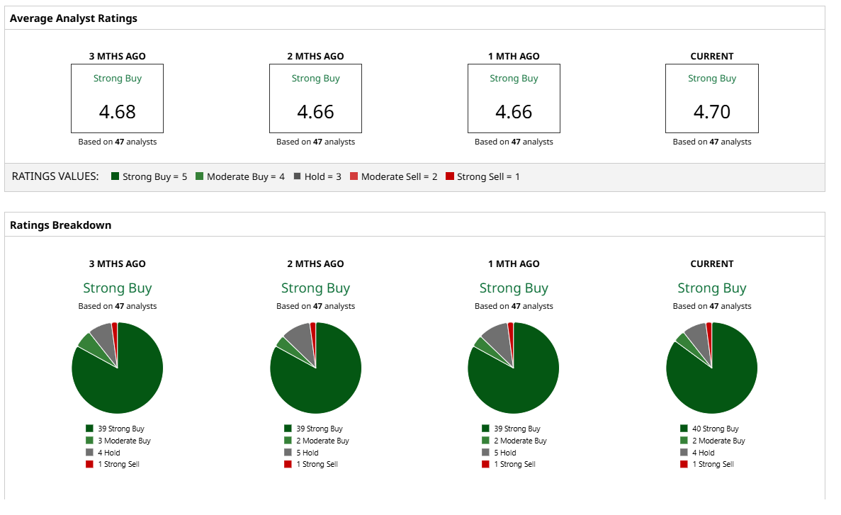Overall, AVGO stock holds a “Strong Buy” rating. Out of the 40 analysts in coverage, 35 rate it a “Strong Buy,” two say it is a “Moderate Buy,” and three recommend a “Hold.” Based on the mean target price of $372.47, the stock has potential upside of 8.5% from current levels. Plus, its high price estimate of $420 indicates the stock could gain as much as 22.4% in the next 12 months.