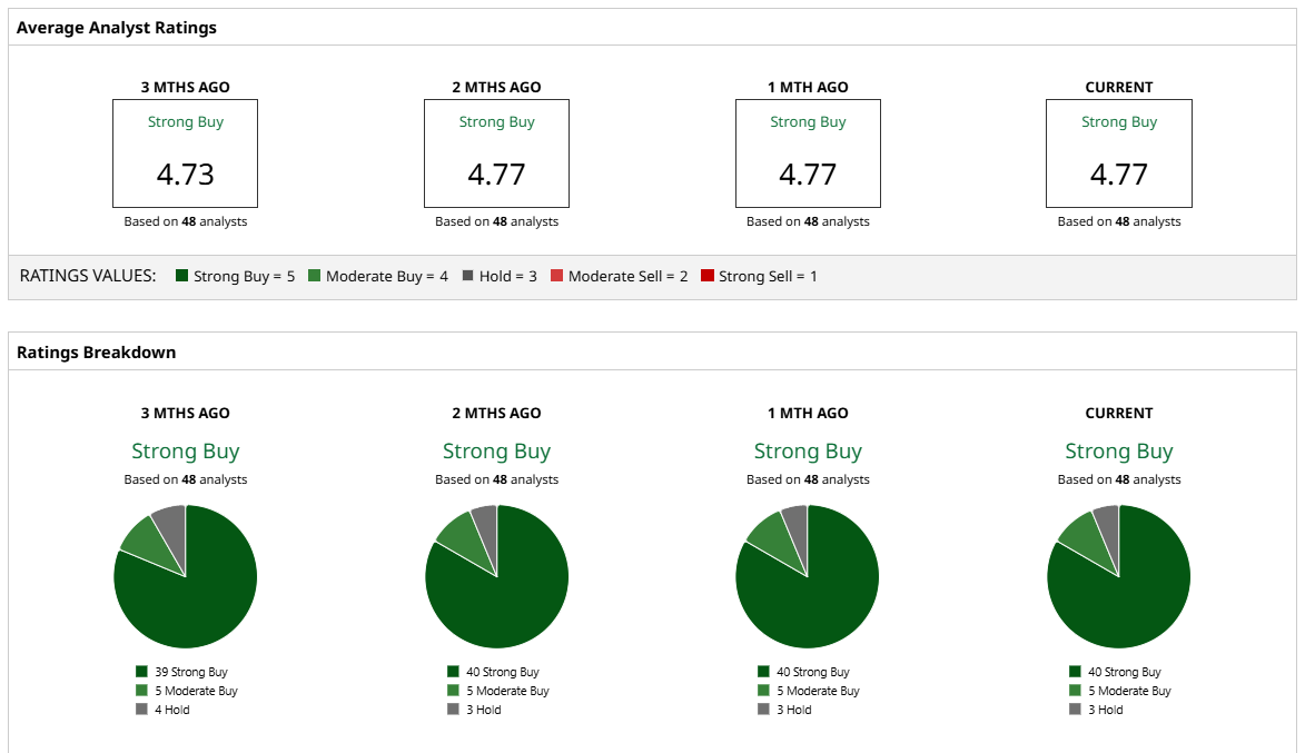Overall, Nvidia stock is a “Strong Buy” on Wall Street. Out of the 47 analysts that cover the stock, 40 have a “Strong Buy” recommendation, with two “Moderate Buy” ratings, four “Hold” ratings, and one “Strong Sell” rating. The average target price for Nvidia stock is $217.14, which implies potential upside of 13% over the next 12 months. The high price estimate of $275 implies the stock can rally as much as 43% from current levels.