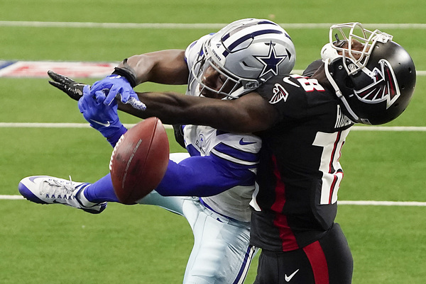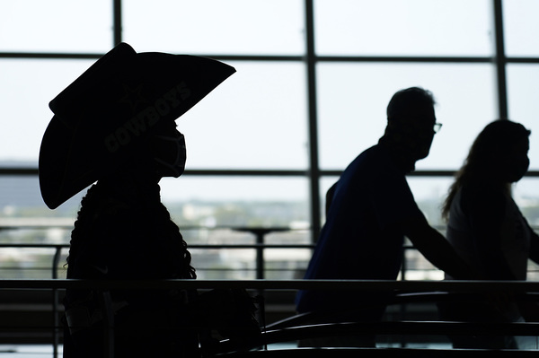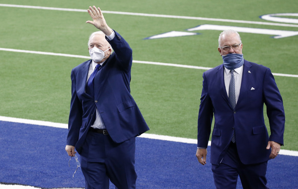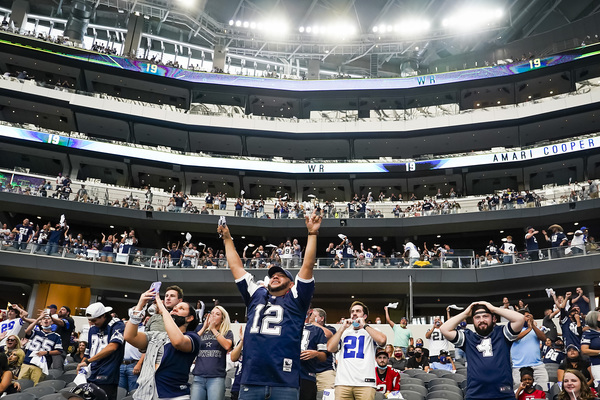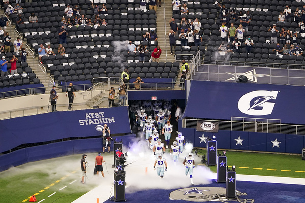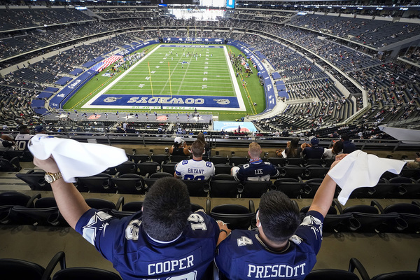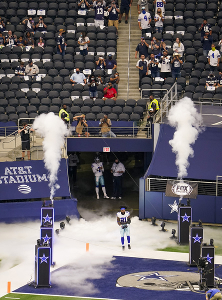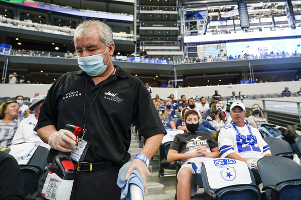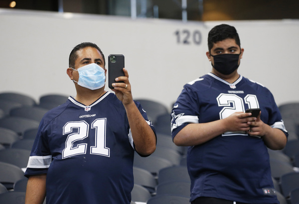 A worker disinfects railings in the seating bowl during the second quarter of an NFL football game between the Dallas Cowboys and the Atlanta Falcons on Sunday, September 20, 2020 at AT&T Stadium in Arlington, Texas. (Smiley N. Pool/The Dallas Morning News/TNS)Dallas Cowboys fans wearing masks along with their gameday paraphernalia head into the stadium before the game against the Atlanta Falcons on Sunday, September 20, 2020 at AT&T Stadium in Arlington, Texas. (Smiley N. Pool/The Dallas Morning News/TNS)Atlanta Falcons wide receiver Brandon Powell (15) is upended by Dallas Cowboys safety Donovan Wilson (37) on a kick return during the second quarter on Sunday, September 20, 2020 at AT&T Stadium in Arlington, Texas. (Smiley N. Pool/The Dallas Morning News/TNS)Atlanta Falcons wide receiver Calvin Ridley (18) catches a touchdown pass as Dallas Cowboys cornerback Chidobe Awuzie (24) defends during the first quarter on Sunday, September 20, 2020 at AT&T Stadium in Arlington, Texas. (Smiley N. Pool/The Dallas Morning News/TNS)Dallas Cowboys running back Ezekiel Elliott celebrates after picking up a first down during the second quarter against the Atlanta Falcons on Sunday, September 20, 2020 at AT&T Stadium in Arlington, Texas. (Smiley N. Pool/The Dallas Morning News/TNS)Atlanta Falcons wide receiver Calvin Ridley (18) reaches the ball into the end zone for a touchdown past Dallas Cowboys cornerback Chidobe Awuzie (24) during the first quarter on Sunday, September 20, 2020 at AT&T Stadium in Arlington, Texas. (Smiley N. Pool/The Dallas Morning News/TNS)Dallas Cowboys running back Ezekiel Elliott scores on a short touchdown run past Atlanta Falcons defensive end Steven Means (55) and strong safety Damontae Kazee (27) during the second quarter on Sunday, September 20, 2020 at AT&T Stadium in Arlington, Texas. (Smiley N. Pool/The Dallas Morning News/TNS)Dallas Cowboys defensive back C.J. Goodwin (29) reaches for the ball to recover an onside kick late in the fourth quarter against the Atlanta Falcons on Sunday, September 20, 2020 at AT&T Stadium in Arlington, Texas. (Smiley N. Pool/The Dallas Morning News/TNS)Dallas Cowboys quarterback Dak Prescott wears a face mask reading "You've Got a Friend In Me" as he warms up before the game against the Atlanta Falcons on Sunday, September 20, 2020 at AT&T Stadium in Arlington, Texas. (Smiley N. Pool/The Dallas Morning News/TNS)Atlanta Falcons wide receiver Brandon Powell (15) is upended by Dallas Cowboys safety Donovan Wilson (37) on a kick return during the second quarter on Sunday, September 20, 2020 at AT&T Stadium in Arlington, Texas. (Smiley N. Pool/The Dallas Morning News/TNS)Dallas Cowboys cornerback Chidobe Awuzie (24) breaks up a pass intended for Atlanta Falcons wide receiver Calvin Ridley (18) during the first quarter on Sunday, September 20, 2020 at AT&T Stadium in Arlington, Texas. (Smiley N. Pool/The Dallas Morning News/TNS)A Dallas Cowboys fan reacts after a call went against their team during the second quarter against the Atlanta Falcons on Sunday, September 20, 2020 at AT&T Stadium in Arlington, Texas. (Smiley N. Pool/The Dallas Morning News/TNS)Dallas Cowboys kicker Greg Zuerlein (2) celebrates with Connor McGovern (66) after kicking a 46-yard game-winning field goal on the final play of a 40-39 victory over the Atlanta Falcons on Sunday, September 20, 2020 at AT&T Stadium in Arlington, Texas. (Smiley N. Pool/The Dallas Morning News/TNS)Alcohol wipes are left at fans' seats before an NFL football game between the Dallas Cowboys and the Atlanta Falcons on Sunday, September 20, 2020 at AT&T Stadium in Arlington, Texas. (Smiley N. Pool/The Dallas Morning News/TNS)Dallas Cowboys fans cheer their team during the second quarter against the Atlanta Falcons on Sunday, September 20, 2020 at AT&T Stadium in Arlington, Texas. (Smiley N. Pool/The Dallas Morning News/TNS)Atlanta Falcons tight end Hayden Hurst celebrates as he scores on a 42-yard touchdown reception past Dallas Cowboys cornerback Daryl Worley on Sunday, September 20, 2020 at AT&T Stadium in Arlington, Texas. (Smiley N. Pool/The Dallas Morning News/TNS)Dallas Cowboys fans take photos of the stadium before an NFL football game against the Atlanta Falcons on Sunday, September 20, 2020 at AT&T Stadium in Arlington, Texas. (Smiley N. Pool/The Dallas Morning News/TNS)Dallas Cowboys quarterback Dak Prescott throws a pass under pressure from the Atlanta Falcons defense during the first quarter on Sunday, September 20, 2020 at AT&T Stadium in Arlington, Texas. (Smiley N. Pool/The Dallas Morning News/TNS)Dallas Cowboys kicker Greg Zuerlein (2) celebrates with Chris Jones and Blake Bell after kicking a 46-yard game-winning field goal on the final play of a 40-39 victory over the Atlanta Falcons on Sunday, September 20, 2020 at AT&T Stadium in Arlington, Texas. (Smiley N. Pool/The Dallas Morning News/TNS)Atlanta Falcons wide receiver Julio Jones (11) is brought down by Dallas Cowboys middle linebacker Jaylon Smith (54), who was penalized on the play, during the second quarter on Sunday, September 20, 2020 at AT&T Stadium in Arlington, Texas. (Smiley N. Pool/The Dallas Morning News/TNS)Dallas Cowboys owner Jerry Jones watches from his suite during the second quarter against the Atlanta Falcons on Sunday, September 20, 2020 at AT&T Stadium in Arlington, Texas. (Smiley N. Pool/The Dallas Morning News/TNS)Dallas Cowboys cornerback Chidobe Awuzie (24) breaks up a pass intended for Atlanta Falcons wide receiver Calvin Ridley (18) during the first quarter on Sunday, September 20, 2020 at AT&T Stadium in Arlington, Texas. (Smiley N. Pool/The Dallas Morning News/TNS)Dallas Cowboys owner and General Manager Jerry Jones waves to fans as he walks off the field with Dallas Cowboys Executive Vice President Stephen Jones during pregame activities on Sunday, September 20, 2020 at AT&T Stadium in Arlington, Texas. (Vernon Bryant/The Dallas Morning News/TNS)Dallas Cowboys fans Fernando (left) and Emmanuel Lopez