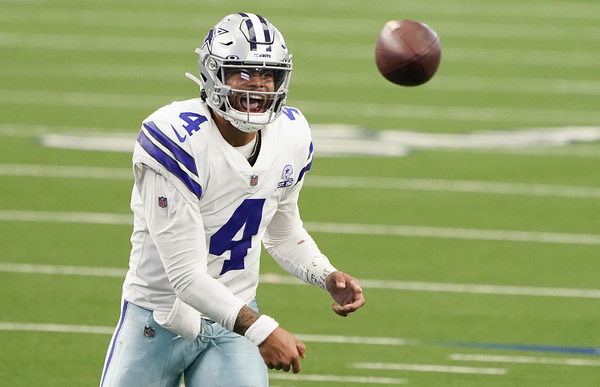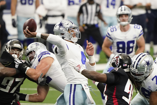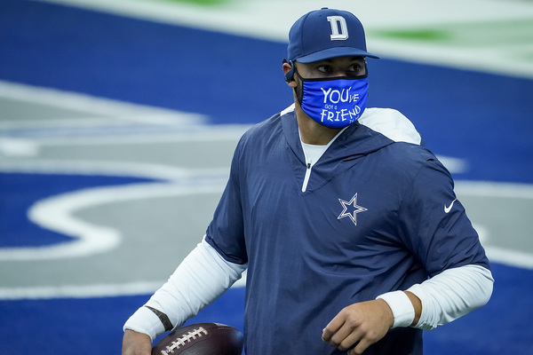 Dallas Cowboys quarterback Dak Prescott warms up before the game against the Atlanta Falcons on Sunday, September 20, 2020 at AT&T Stadium in Arlington, Texas. (Smiley N. Pool/The Dallas Morning News/TNS)