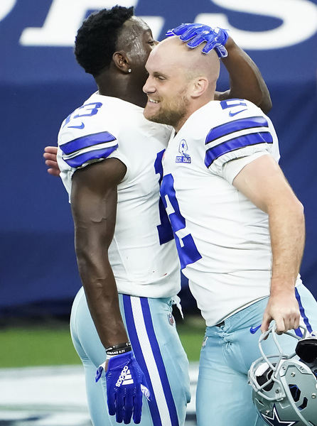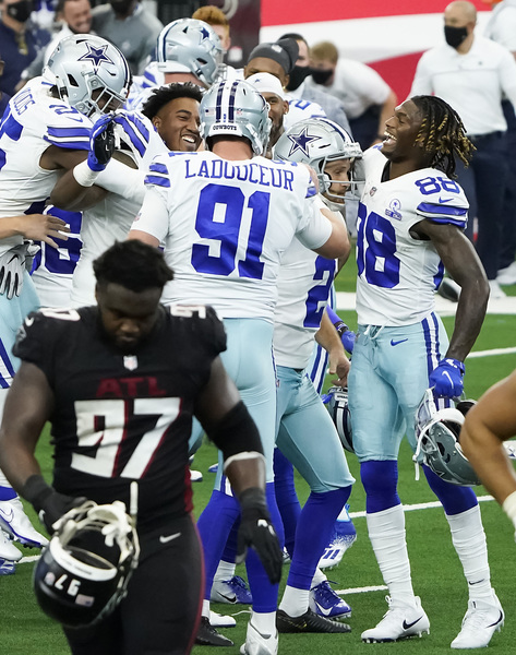Dallas Cowboys kicker Greg Zuerlein (2) celebrates with wide receiver Michael Gallup (13) after kicking a 46-yard game-winning field goal on the final play of a 40-39 victory over the Atlanta Falcons on Sunday, September 20, 2020 at AT&T Stadium in Arlington, Texas. (Smiley N. Pool/The Dallas Morning News/TNS)