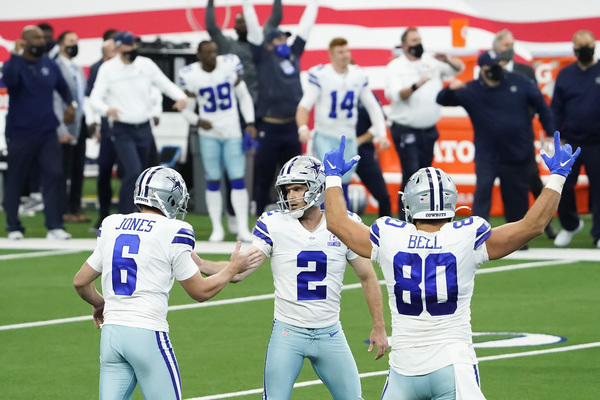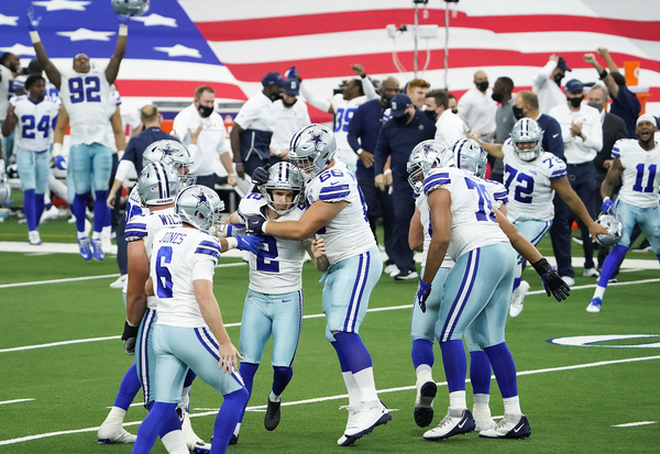 Cowboys kicker Greg Zuerlein made a 46-yard game-winning field goal that wasn't even possible if not for CJ Goodwin recovering an onside kick with 1:49 left in the game. Goodwin's recovery allowed the Cowboys, with no timeouts to give Zuerlein his chance. He made his first game-winning kick as a Cowboy possible.