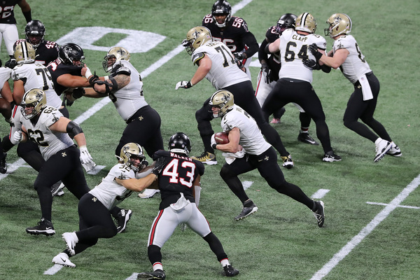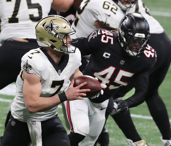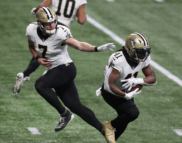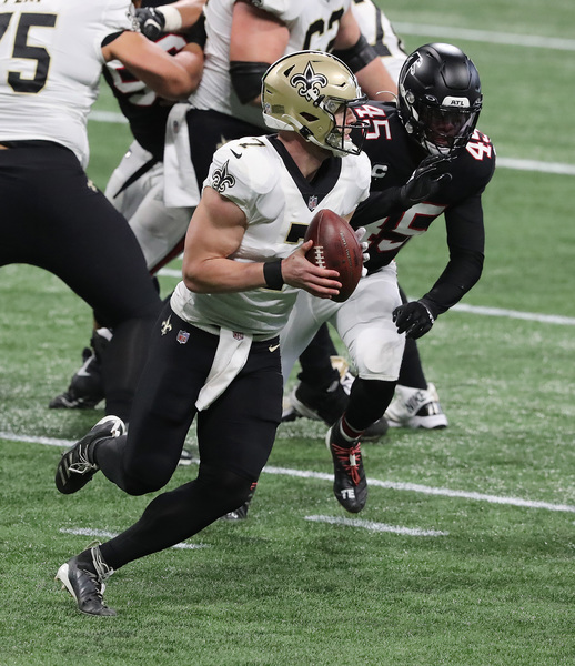 New Orleans Saints quarterback Taysom Hill uses his legs to help run out the clock in the final minutes of a 21-16 victory over the Atlanta Falcons on Sunday, Dec. 6, 2020, in Atlanta, Georgia. (Curtis Compton/Atlanta Journal-Constitution/TNS)