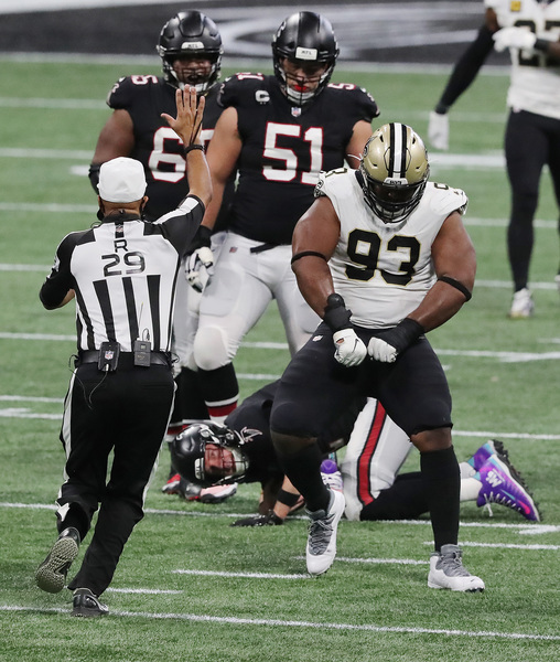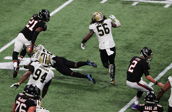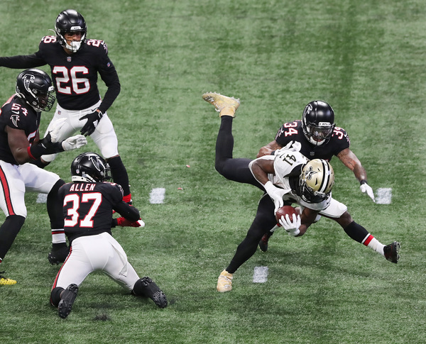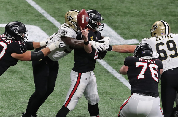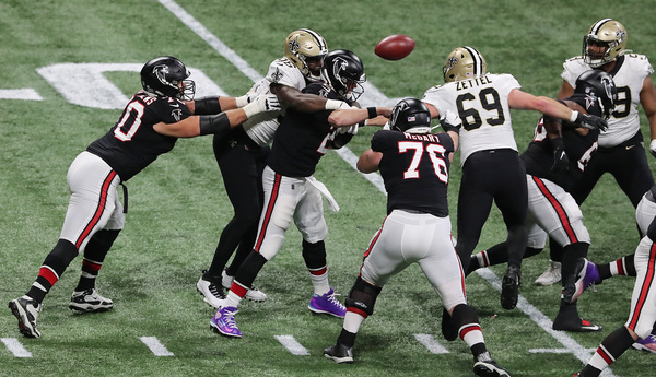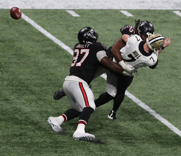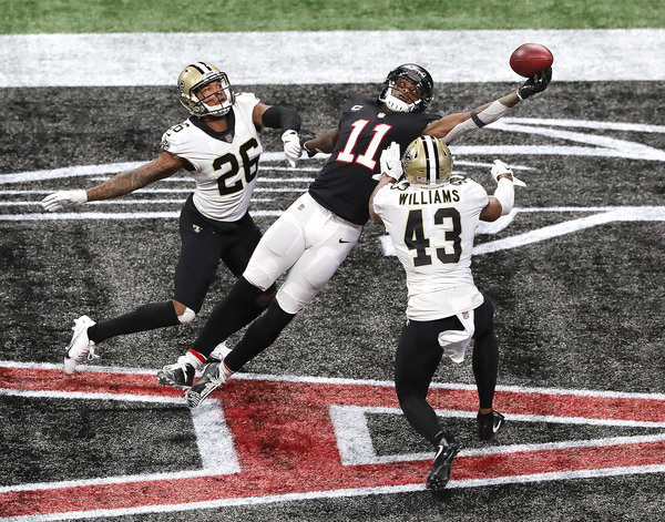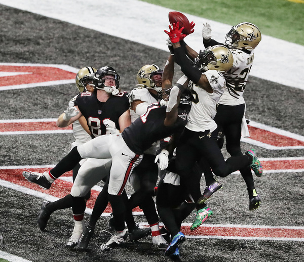 In what would have been the go-ahead touchdown in the final two minutes, Atlanta Falcons wide receiver Julio Jones can't haul in the fourth down attempt from Matt Ryan in the end zone as the ball goes off his fingertips, with New Orleans Saints cornerback P.J. Williams (left) and safety Marcus Williams (right) defending during the fourth quarter on Sunday, Dec. 6, 2020, in Atlanta, Georgia. The Saints beat the Falcons 21-16. (Curtis Compton/Atlanta Journal-Constitution/TNS)Atlanta Falcons defenders surround New Orleans Saints tight end Jared Cook (center) while he catches a touchdown pass to take a 14-6 lead during the second quarter on Sunday, Dec. 6, 2020, in Atlanta, Georgia. (Curtis Compton/Atlanta Journal-Constitution/TNS)Atlanta Falcons running back Todd Gurley loses 7 yards on a third down and 2 attempt during the final minutes against the Saints during the fourth quarter on Sunday, Dec. 6, 2020, in Atlanta, Georgia. (Curtis Compton/Atlanta Journal-Constitution/TNS)Atlanta Falcons Grady Jarrett, left, and Steven Means hit New Orleans Saints quarterback Taysom Hill, forcing a fumble that the Falcons recovered during the fourth quarter on Sunday, Dec. 6, 2020, in Atlanta, Georgia. (Curtis Compton/Atlanta Journal-Constitution/TNS)New Orleans Saints running back Alvin Kamara dives into the end zone past Atlanta Falcons cornerback Darqueze Dennard for a touchdown to take a 21-9 lead during the third quarter on Sunday, Dec. 6, 2020, in Atlanta, Georgia. (Curtis Compton/Atlanta Journal-Constitution/TNS)New Orleans Saints quarterback Taysom Hill gets off a pass under pressure from Atlanta Falcons defensive end Dante Fowler during the third quarter on Sunday, Dec. 6, 2020, in Atlanta, Georgia. (Curtis Compton/Atlanta Journal-Constitution/TNS)New Orleans Saints quarterback Taysom Hill breaks away from Atlanta Falcons linebacker Deion Jones for a long gain into Falcons' territory to setup a touchdown pass on the next play to Tre'Quan Smith to take a 7-0 lead during the first quarter on Sunday, Dec. 6, 2020, in Atlanta, Georgia. (Curtis Compton/Atlanta Journal-Constitution/TNS)New Orleans Saints quarterback Taysom Hill breaks away from Atlanta Falcons linebacker Deion Jones for a long gain into Falcons' territory to setup a touchdown pass on the next play to Tre'Quan Smith to take a 7-0 lead during the first quarter on Sunday, Dec. 6, 2020, in Atlanta, Georgia. (Curtis Compton/Atlanta Journal-Constitution/TNS)New Orleans Saints defensive tackle David Onyemata reacts to sacking Atlanta Falcons quarterback Matt Ryan during the second quarter on Sunday, Dec. 6, 2020, in Atlanta, Georgia. (Curtis Compton/Atlanta Journal-Constitution/TNS)After breaking through three defenders, New Orleans Saints running back Alvin Kamara dives into the end zone past Atlanta Falcons cornerback Darqueze Dennard for a touchdown to take a 21-9 lead during the third quarter on Sunday, Dec. 6, 2020, in Atlanta, Georgia. (Curtis Compton/Atlanta Journal-Constitution/TNS)New Orleans Saints defensive end Carl Granderson knocks the ball out for a turnover as he hammers Atlanta Falcons quarterback Matt Ryan during the fourth quarter on Sunday, Dec. 6, 2020, in Atlanta, Georgia. (Curtis Compton/Atlanta Journal-Constitution/TNS)A deep pass to Atlanta Falcons wide receiver Julio Jones falls incomplete in the end zone as time expires with the New Orleans Saints defending to hold on to a 21-16 victory on Sunday, Dec. 6, 2020, in Atlanta, Georgia. (Curtis Compton/Atlanta Journal-Constitution/TNS)New Orleans Saints defensive end Carl Granderson knocks the ball out for a turnover as he hammers Atlanta Falcons quarterback Matt Ryan during the fourth quarter on Sunday, Dec. 6, 2020, in Atlanta, Georgia. (Curtis Compton/Atlanta Journal-Constitution/TNS)