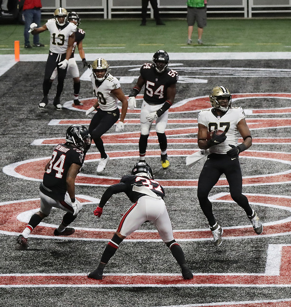 Atlanta Falcons defenders look on as New Orleans Saints tight end Jared Cook catches a touchdown pass to take a 14-6 lead during the second quarter on Sunday, Dec. 6, 2020, in Atlanta, Georgia. (Curtis Compton/Atlanta Journal-Constitution/TNS)
