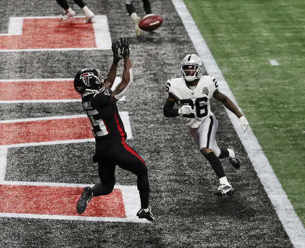Atlanta Falcons wide receiver Brandon Powell catches a touchdown pass in the end zone past Las Vegas Raiders cornerback Nevin Lawson for a 30-6 lead during the third quarter on Sunday, Nov. 29, 2020, in Atlanta, Georgia. (Curtis Compton/Atlanta Journal-Constitution/TNS)