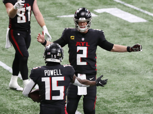 Atlanta Falcons quarterback Matt Ryan and wide receiver Brandon Powell celebrate Powell's touchdown reception against the Las Vegas Raiders for a 30-6 lead during the third quarter on Sunday, Nov. 29, 2020, in Atlanta, Georgia. (Curtis Compton/Atlanta Journal-Constitution/TNS)