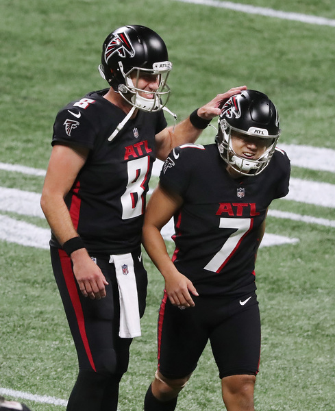 Atlanta Falcons backup quarterback Matt Schaub, coming in to relieve Matt Ryan, gives kicker Younghoe Koo a pat on the helmet after his fieldgoal for a 43-6 lead over the Las Vegas Raiders during the fourth quarter on Sunday, Nov. 29, 2020, in Atlanta, Georgia. (Curtis Compton/Atlanta Journal-Constitution/TNS)